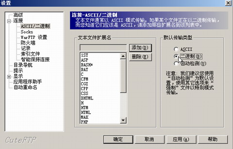 1.如果您采用的是Cuteftp來(lái)上傳系統(tǒng),請(qǐng)參照下圖進(jìn)行設(shè)置:編輯-設(shè)置-傳輸類(lèi)型-二進(jìn)制,如圖所示: