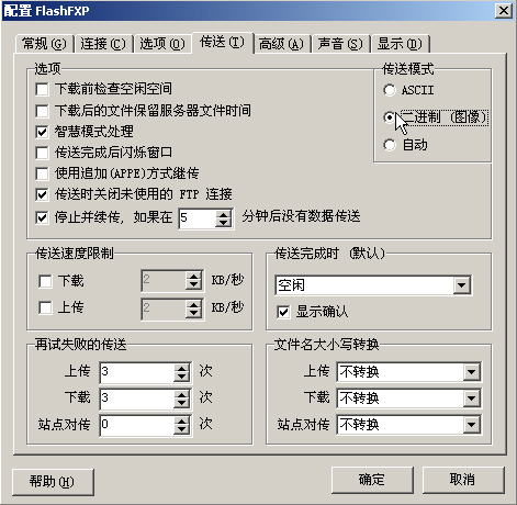 2.如果你采用的是Flashfxp來(lái)上傳系統(tǒng),請(qǐng)參照下圖進(jìn)行設(shè)置:選項(xiàng)-參數(shù)設(shè)置-傳送-二進(jìn)制 如圖所示